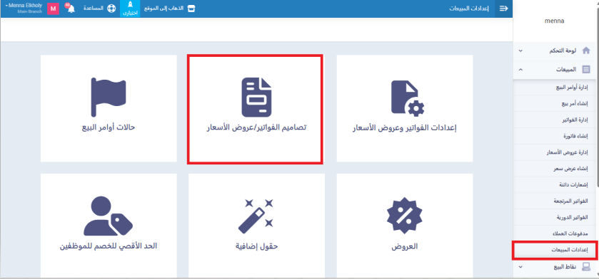 للذهاب إلى قوالب الفواتير للتعديل على التصميمات اضغط على “إعدادات المبيعات” المنسدلة عن “المبيعات” بالقائمة الرئيسية، ثم اضغط على “تصاميم الفواتير/عروض الأسعار”.