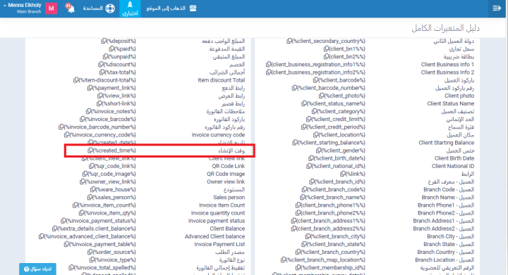 المتغير الخاص بوقت إنشاء الفاتورة يسمى وقت الإنشاء {%created_time%}