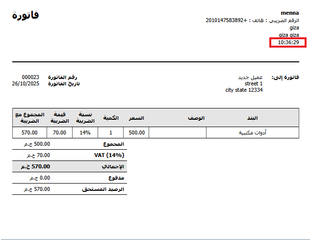 وأخيرًا عند إنشاء الفاتورة، سيظهر لك وقت الإنشاء كما موضح بالصورة التالية: