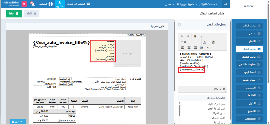 اختر المكان المراد إظهار وقت إنشاء الفاتورة من القائمة الجانبية أو بالضغط على هذا القسم في الفاتورة نفسها، ضع مؤشر السهم في المكان المراد إظهار الحقل الخاص بالوقت فيه، اضغط على دليل المتغيرات الكامل، وانسخ الحقول الخاصة بالوقت وقم بإضافتها ثم اضغط على زر “حفظ”.