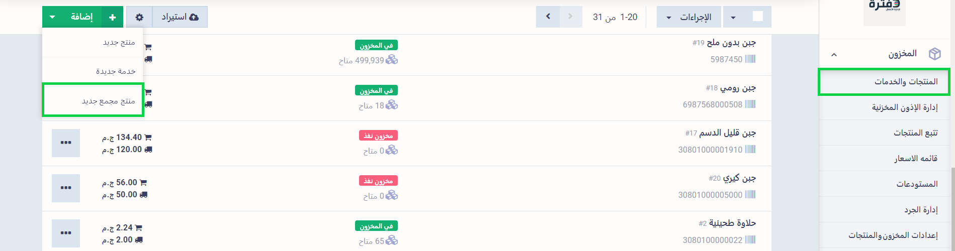 اضغط على “المنتجات والخدمات” المنسدلة عن “المخزون” بالقائمة الرئيسية، ثم اضغط على زر “إضافة” واختر “منتج مجمع جديد”.
