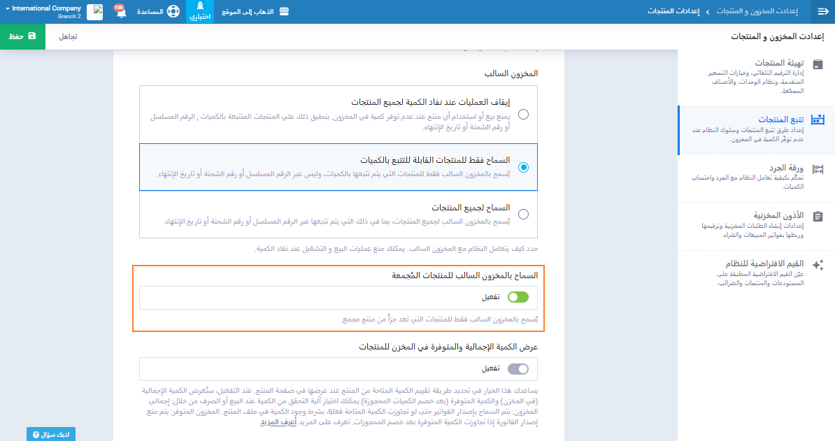 في حالة كانت نوع التجميعة معد مسبقًا؛ يمكنك إتاحة الصرف بالسالب من رصيد المخزون للمنتجات المكونة للمنتجات المجمعة، وذلك بالتوجه إلى “إعدادات المخزون والمنتجات” المنسدلة عن “المخزون” بالقائمة الرئيسية ثم الضغط على “إعدادات المنتجات” وتفعيل إعداد ““ ثم الضغط على زر “حفظ”.