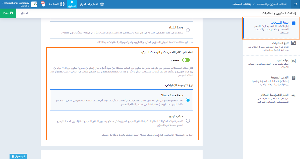 فعّل إعداد “إتاحة نظام التجميعات والوحدات المركبة” ثم اختر نوع التجميع: