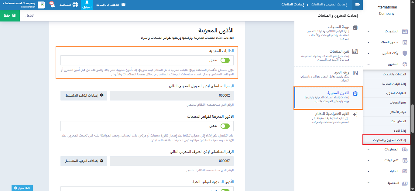 اضعط على “إعدادات المخزون” المنسدلة عن “المخزون” بالقائمة الرئيسية ثم اضغط على بطاقة “عام” ثم فعّل إعداد الطلبات المخزنية واضغط على زر “حفظ”.