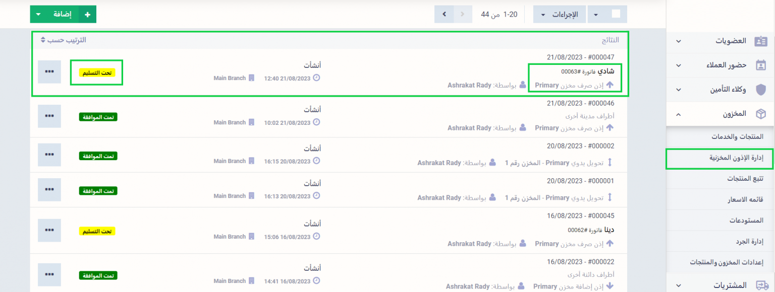 نجد بعدها انقسام الإذن المخزني إلى إذن خاص بالمنتجات التي تم الموافقة عليها بالكميات المحددة بالحالة “تمت الموافقة”، وإذن آخر يتم إنشاؤه تلقائيًا، مضمنًا المنتجات غير الموافق عليها بالحالة “تحت التسليم”، ويلاحظ أن الإذن الجديد التلقائي متفرعًا عن نفس الفاتورة المنشأ عنها الإذن المخزني الأصلي.