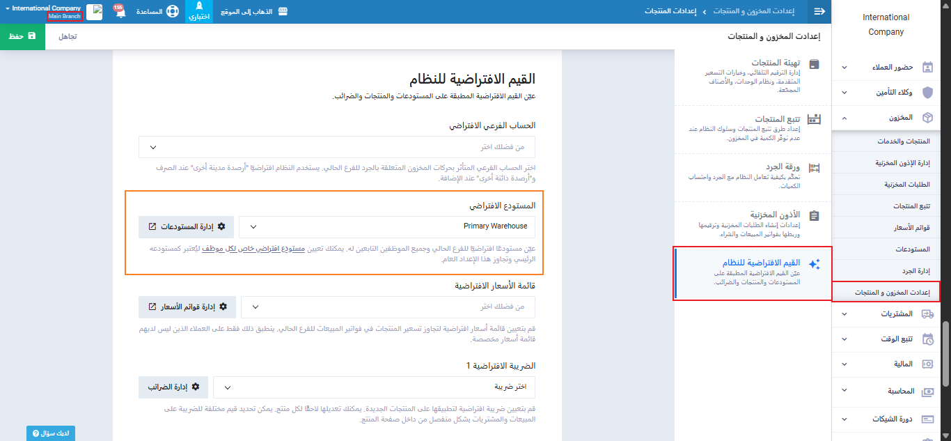 لتعيين مستودع افتراضي لهذا الفرع؛ اضغط على “إعدادات المخزون والمنتجات” المنسدلة عن “المخزون” بالقائمة الرئيسية ثم اضغط على “إعدادات المنتجات” ومن القائمة المنسدلة عن حقل “المستودع الافتراضي” اختر المستودع المراد جعله افتراضيًا لهذا الفرع ثم اضغط على زر “حفظ”.