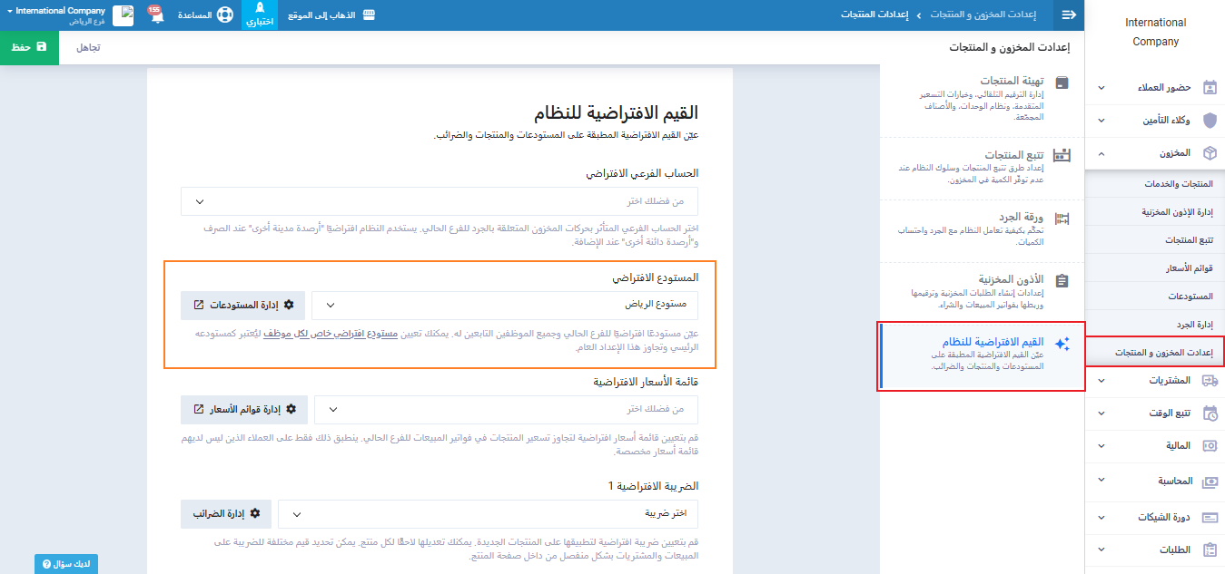 يمكننا تعيين مستودع افتراضي مختلف لهذا الفرع بنفس الطريقة، بالضغط على “إعدادات المخزون والمنتجات” المنسدلة عن “المخزون” بالقائمة الرئيسية ثم اختيار المستودع المراد تعيين كافتراضي من القائمة المنسدلة عن حقل “المستودع الافتراضي” في هذا المثال نختار “مخزن فرع الرياض” ثم نضغط على زر “حفظ”.