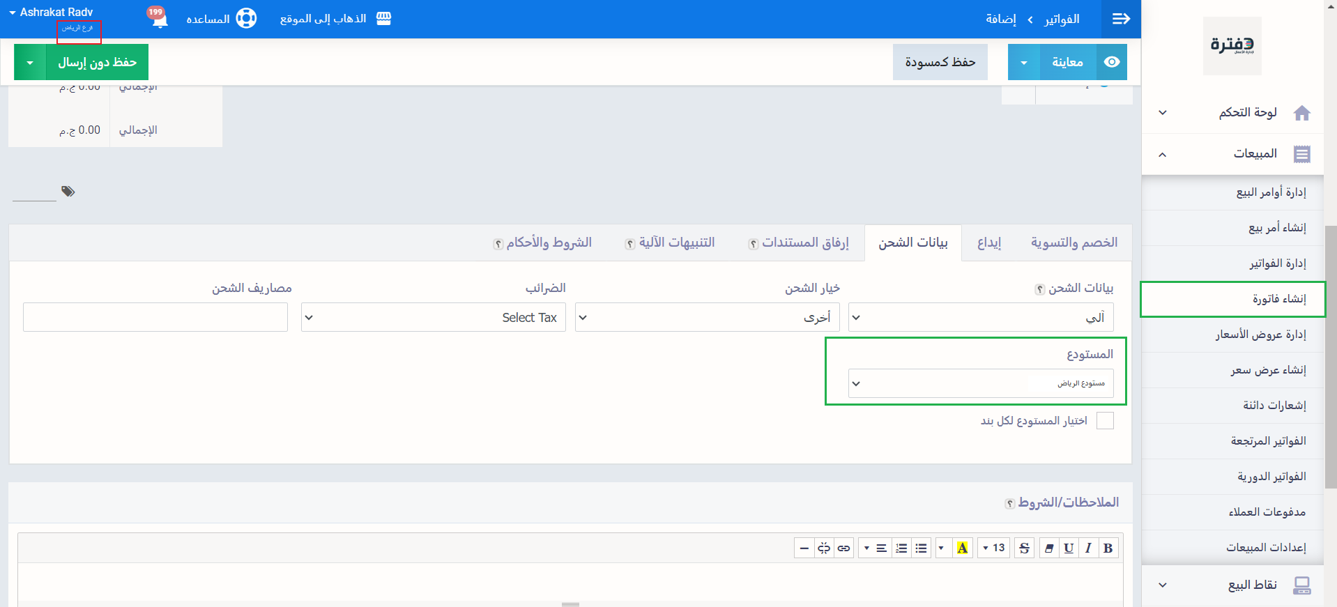 عند إنشاء فاتورة في هذا الفرع نفسه نجد في“بيانات الشحن” المستودع الافتراضي هو نفسه المستودع الذي تم تعيينه كافتراضي لهذا الفرع، في هذا المثال يظهر “مخزن فرع الرياض” كافتراضي .