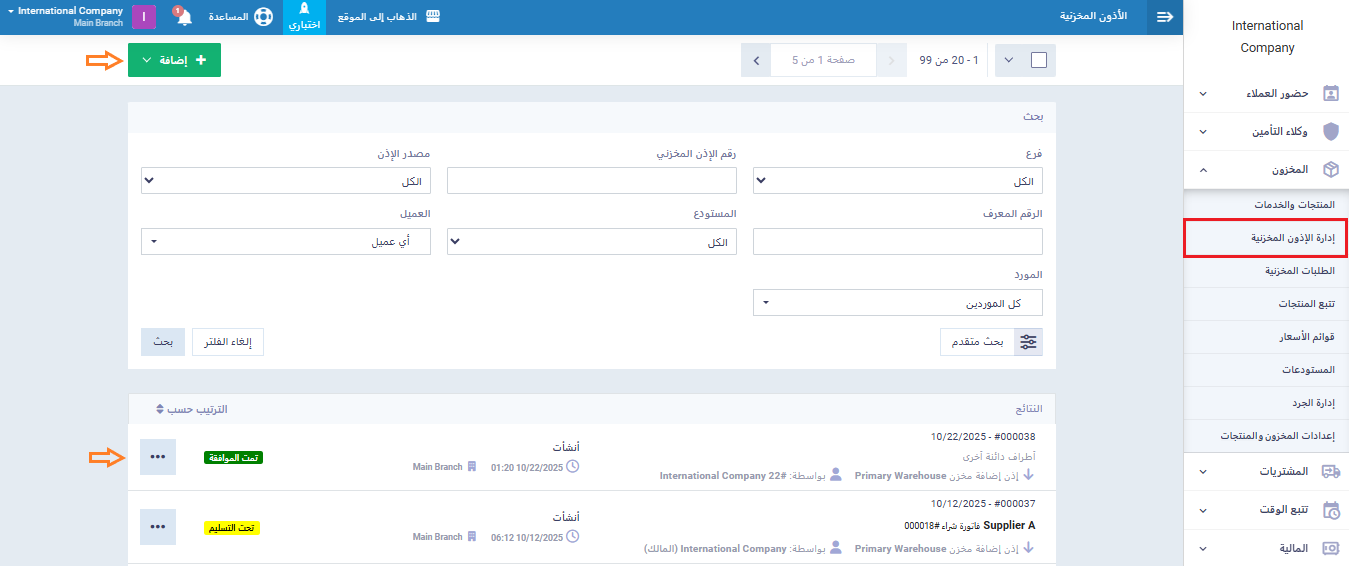 من خلال قائمة الإذون المخزنية يمكنك إنشاء إذن مخزني جديد او اختيار إذن معد مسبقا.