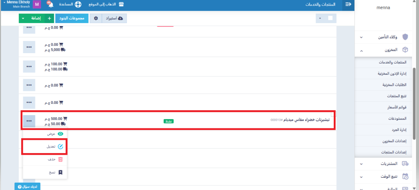 انتقل إلى شاشة “المنتجات والخدمات” من القائمة الرئيسية، واختر المنتج المراد إضافة الرابط له، ثم اضغط على زر “تعديل”.