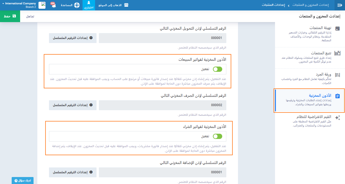 قم بتفعيل “الأذون المخزنية لفواتير المبيعات” للتحكم في “أذون الصرف”، وقم بتفعيل “الأذون المخزنية لفواتير الشراء” للتحكم في “أذون الإضافة”، يمكنك بالطبع تفعيل أحدهما أو كلاهما.