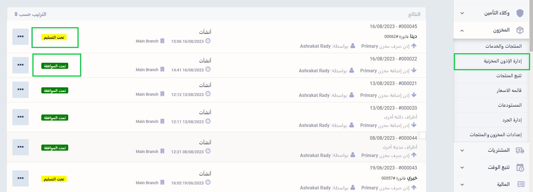 اضغط على “إدارة الأذون المخزنية” المنسدلة عن “المخزون” بالقائمة الرئيسية، لتجد الأذون التي “تمت الموافقة” عليها، وكذلك الأذون “تحت التسليم” التي بانتظار الموافقة أو الرفض.