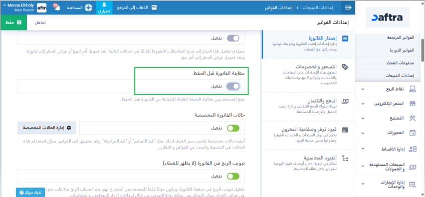 ولكن في حالة عدم رغبتك تفعيل هذه الخاصية لكي لا يتاح الحصول على أي نسخة أو شكل نهائي للفاتورة دون الحفظ النهائي، يمكنك التوجه إلى “إعدادات المبيعات” المنسدلة عن “المبيعات” بالقائمة الرئيسية ثم اختيار “إعدادات الفواتير”، ومنها قم بإلغاء تفعيل خاصية “معاينة الفاتورة قبل الحفظ”.