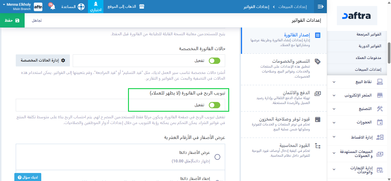 فعّل خاصية “إظهار ربح الفاتورة” واضغط “حفظ”.