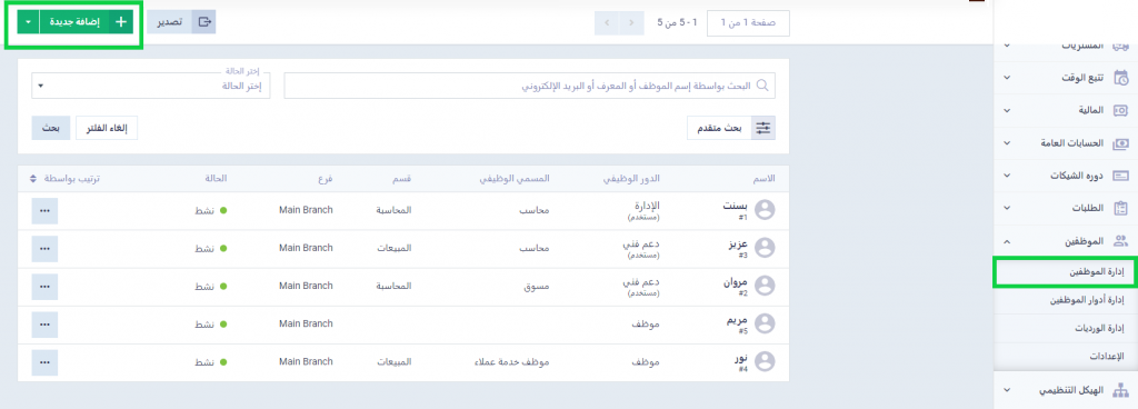 بالتوجه إلى “إدارة الموظفين” المنسدلة عن “الموظفين” بالقائمة الرئيسية، اضغط على السهم بجانب زر “إضافة جديد” واختر “موظف” أو “مستخدم” بحسب ما تريد.