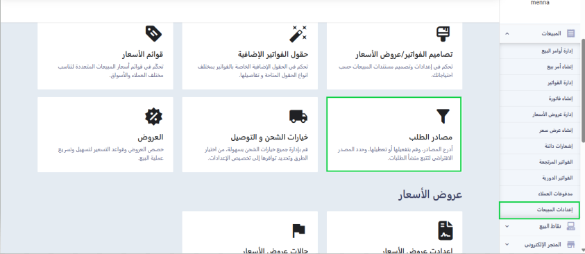 اضغط على “إعدادات المبيعات” المنسدلة عن “المبيعات” بالقائمة الرئيسية ثم اضغط على “مصادر الطلب”.
