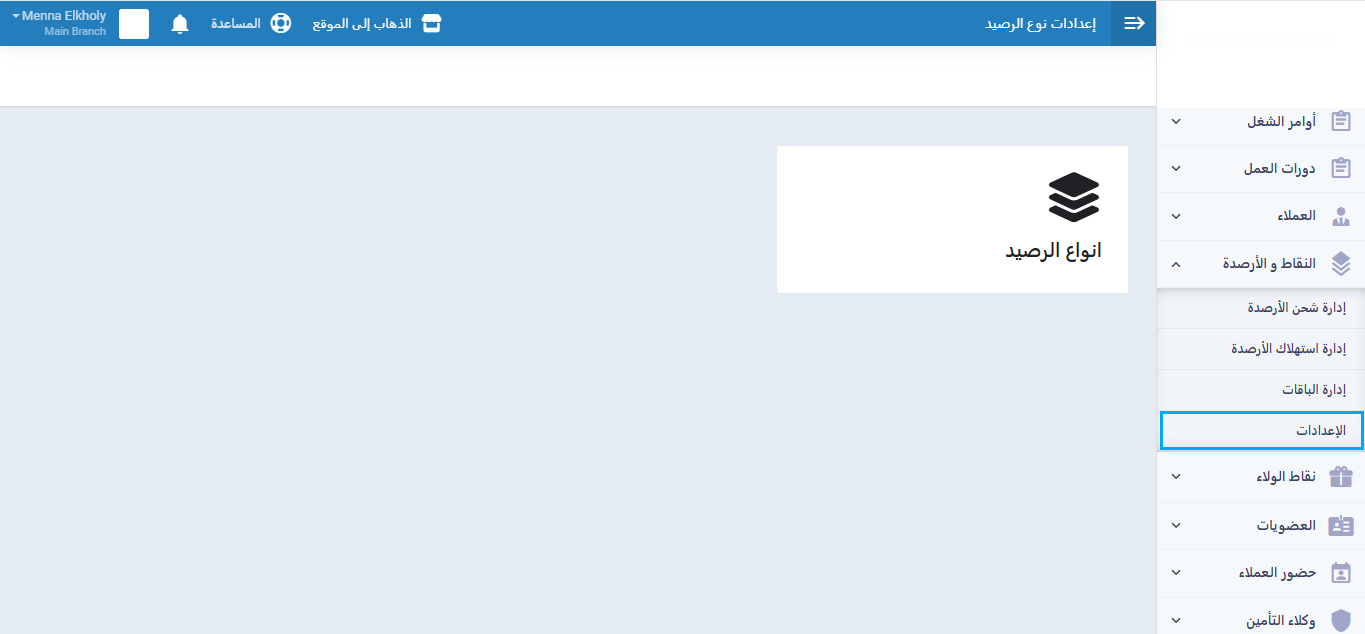 اضغط على “الإعدادات” المنسدلة عن “النقاط والأرصدة” بالقائمة الرئيسية واضغط على بطاقة “أنواع الرصيد”.