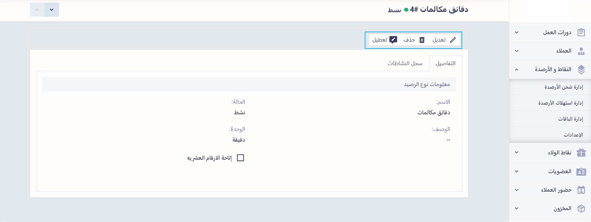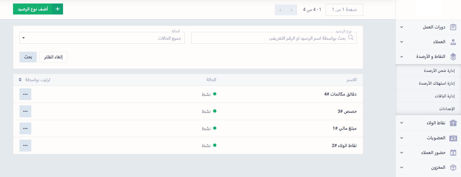 - الحالة: اختر إن كان نوع الرصيد هذا نشط أم غير نشط.