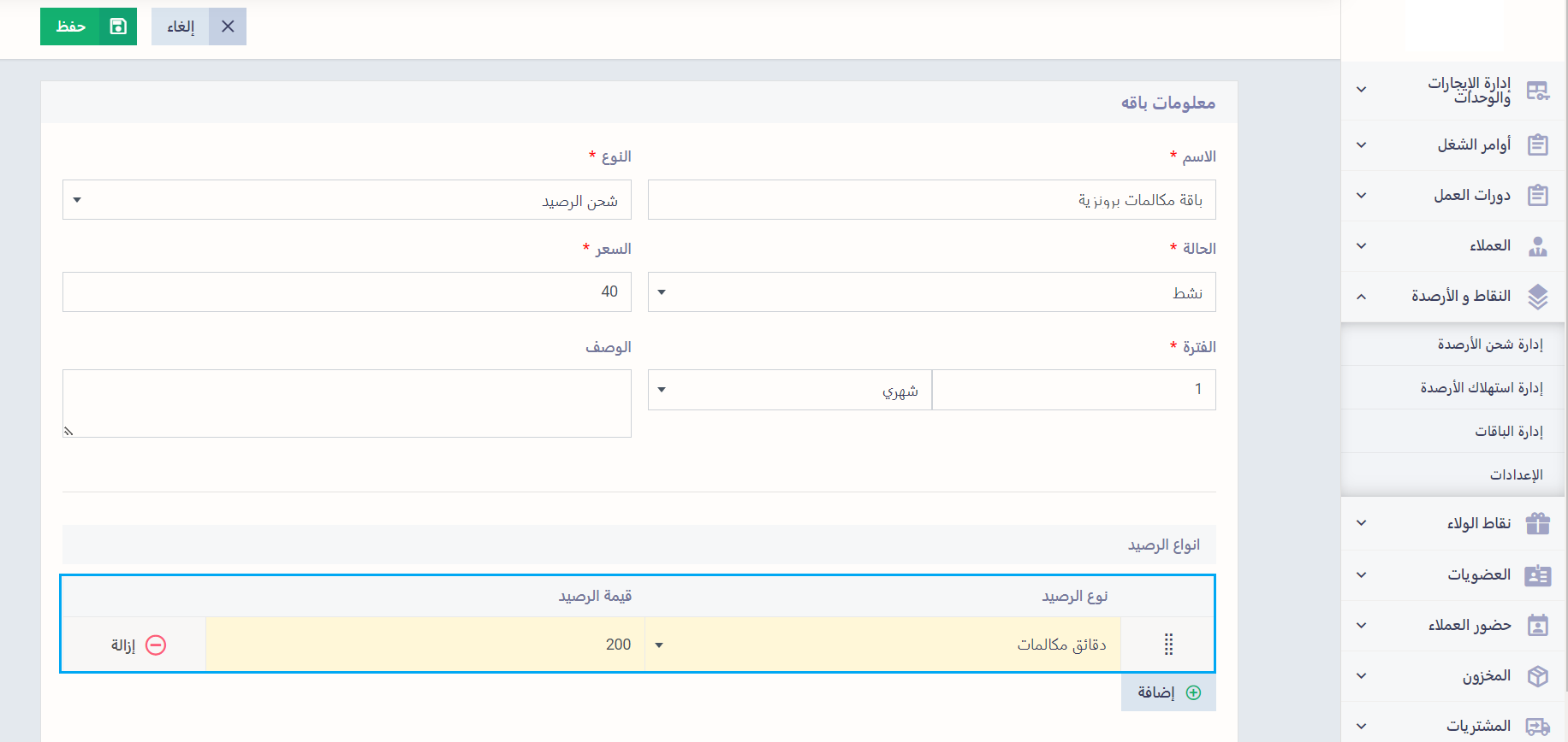 - الوحدة: ادخل وحدة الرصيد مثل دقيقة/ ميجا بايت/ مبلغ مالي.