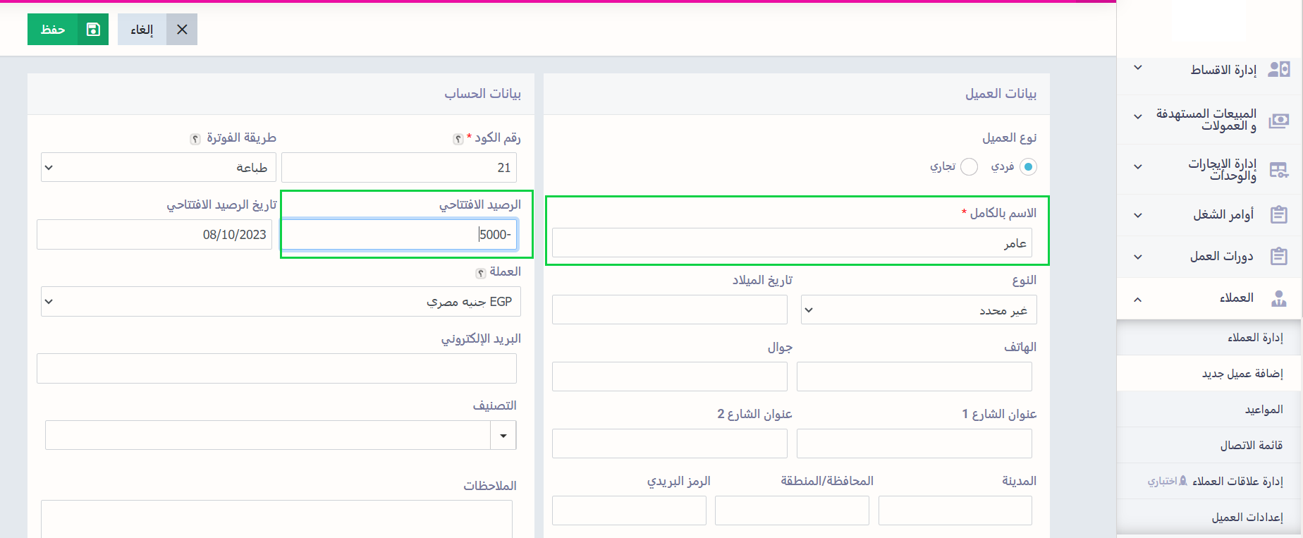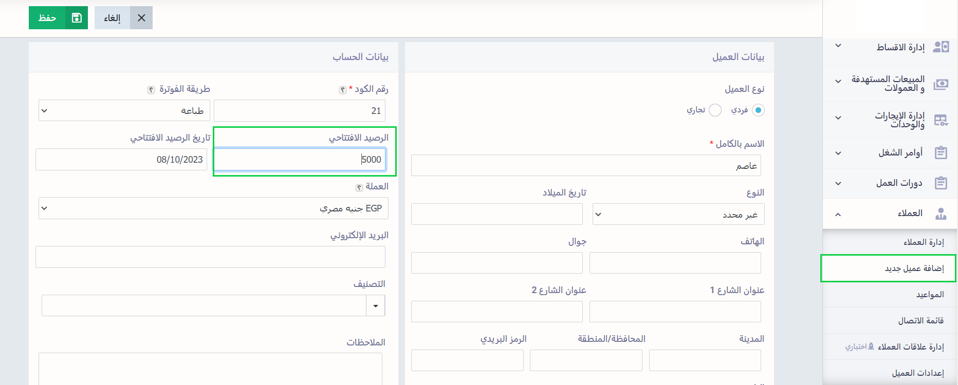 إضافة الرصيد الافتتاحي لعميل جديد