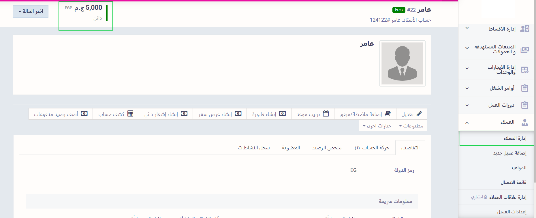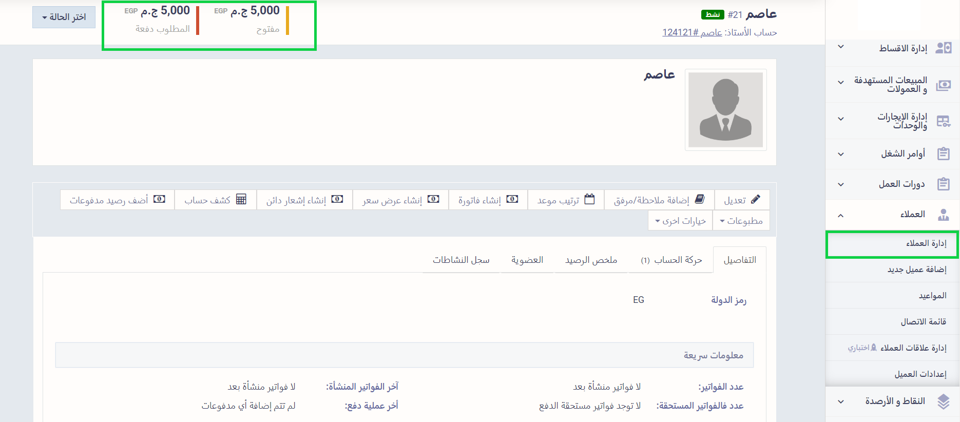 ليظهر لك رصيد العميل في ملفه الشخصي ضمن “المطلوب دفعه”.