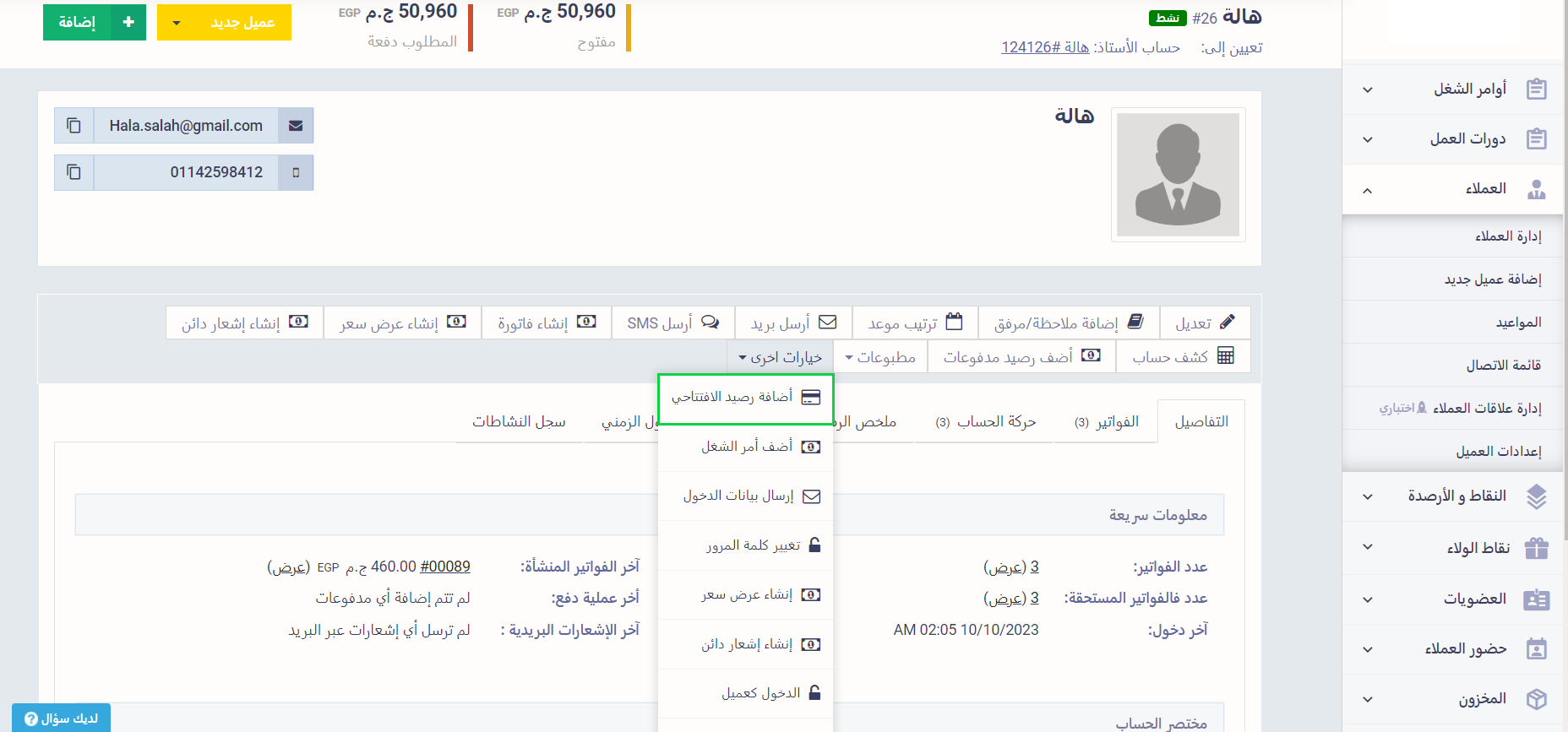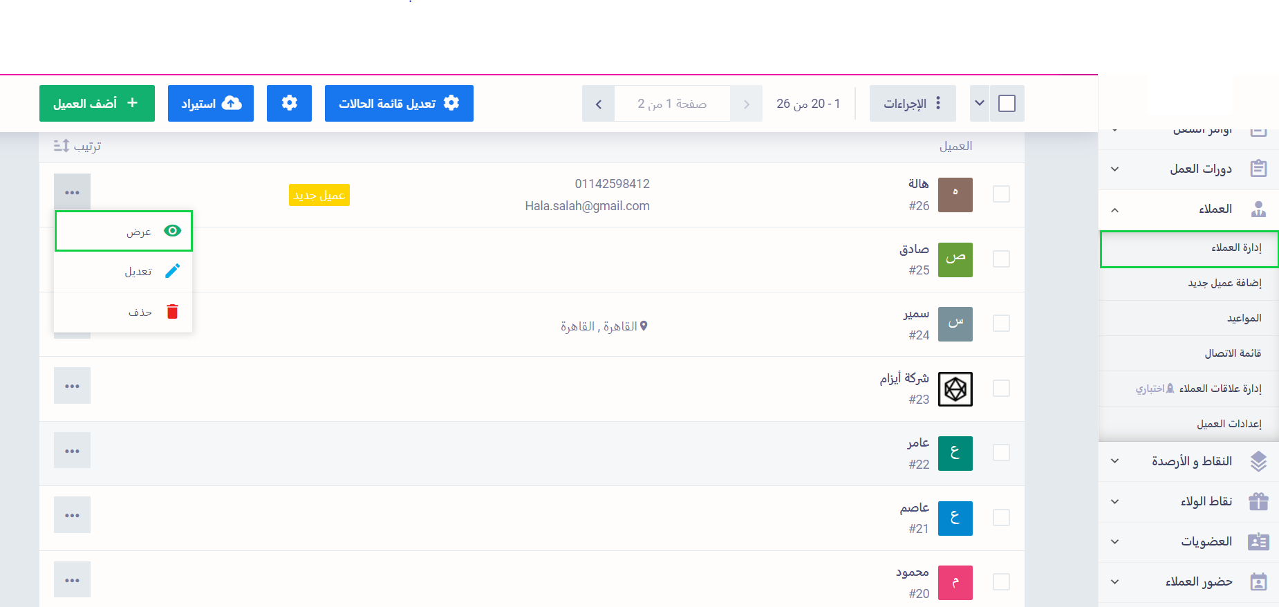 اضغط على “إدارة العملاء” المنسدلة عن “العملاء” بالقائمة الرئيسية، واضغط على الثلاث نقاط بجوار اسم العميل المراد إضافة رصيد افتتاحي له، ثم اضغط على “عرض” من القائمة المنسدلة لاستعراض ملف العميل.
