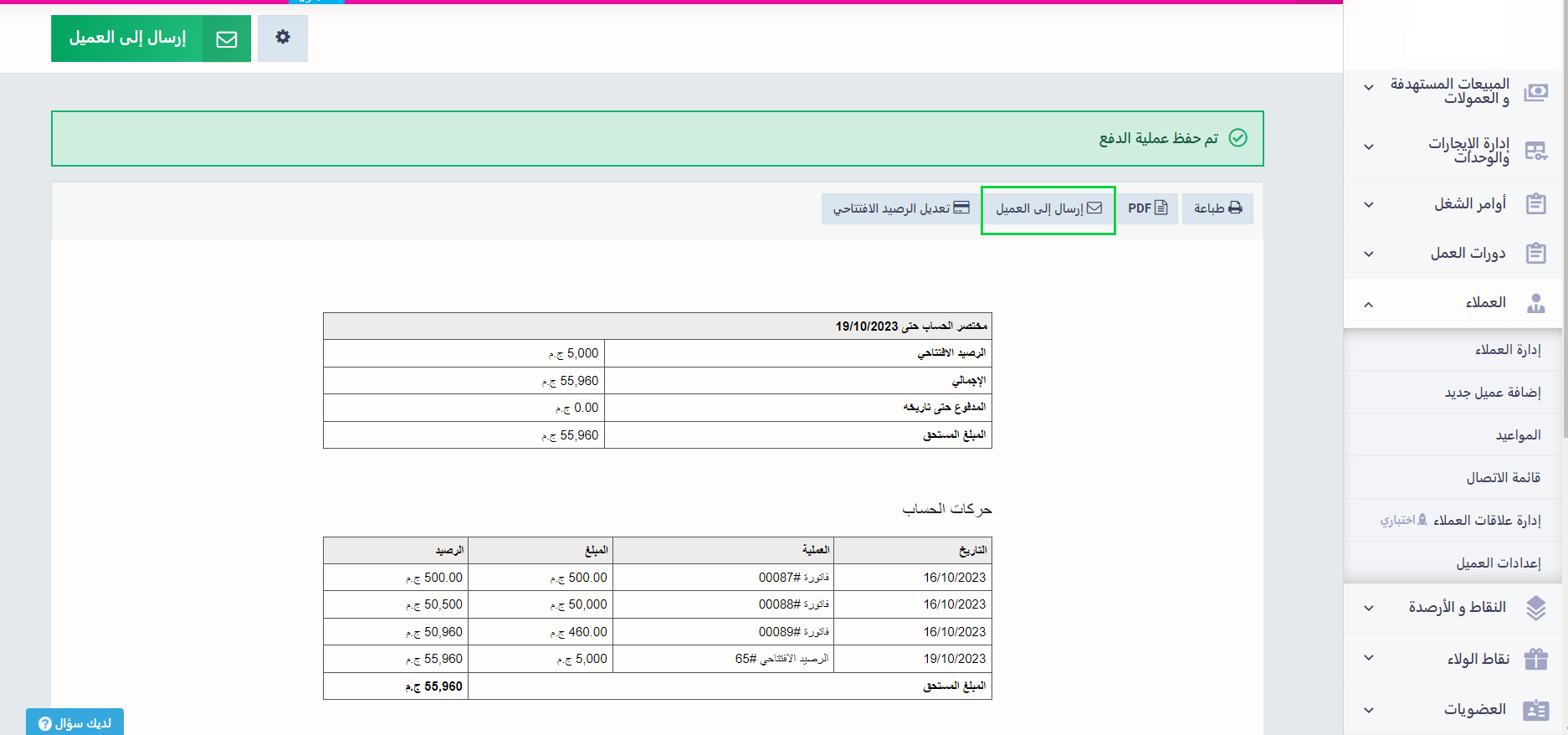 بعد إضافة الرصيد الافتتاحي يمكنك طباعة أو حفظ حركة الحساب متضمنة هذا الرصيد، او اضغط على “إرسال إلى العميل” إن أردت مشاركة حركة الحساب معه.