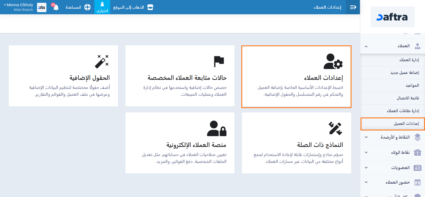 اضغط على “إعدادات العميل” المنسدلة عن “العملاء” بالقائمة الرئيسية واضغط على بطاقة “إعدادات العملاء”.