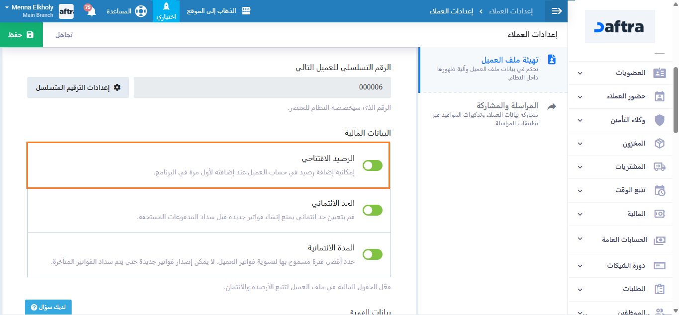 فعّل حقل “الرصيد الافتتاحي للعملاء” واضغط على زر “حفظ”.