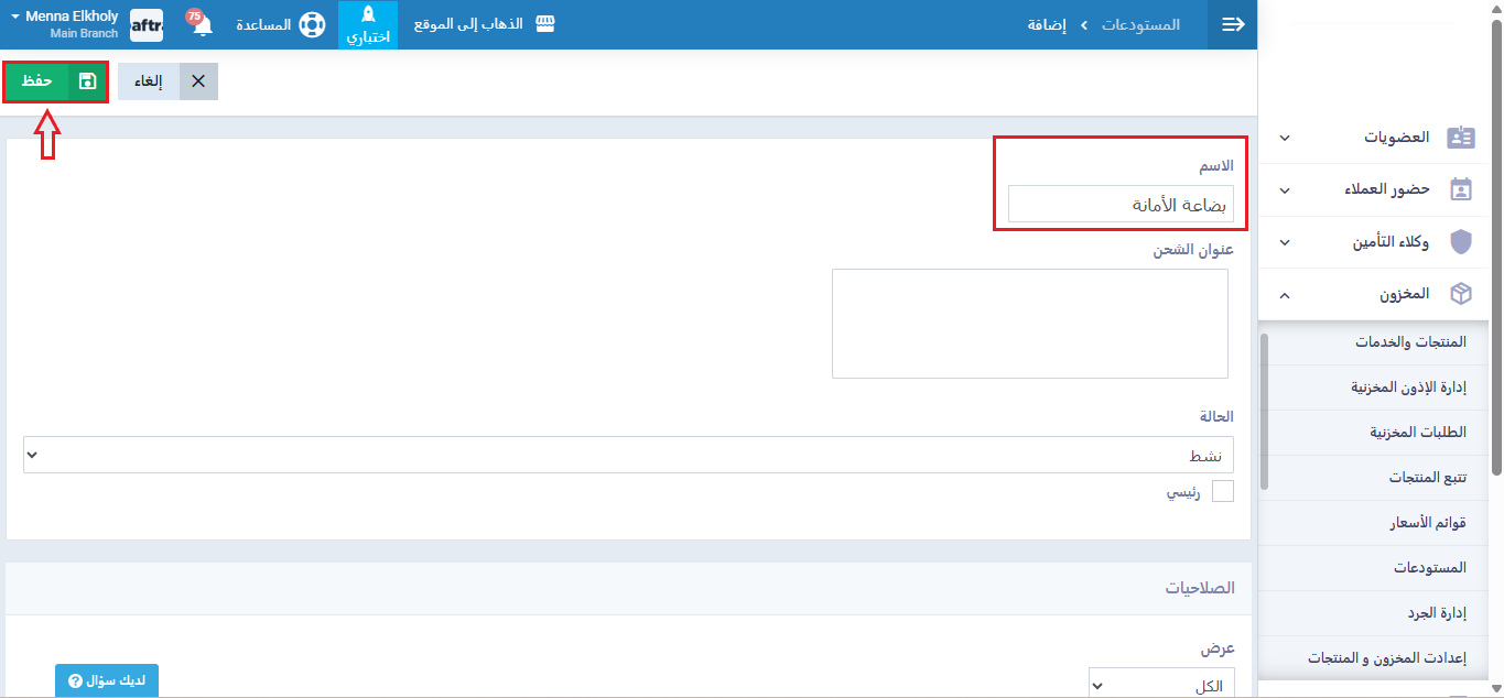 • قم بملء البيانات الأساسية، وأدخل اسم المستودع: بضاعة الأمانة.