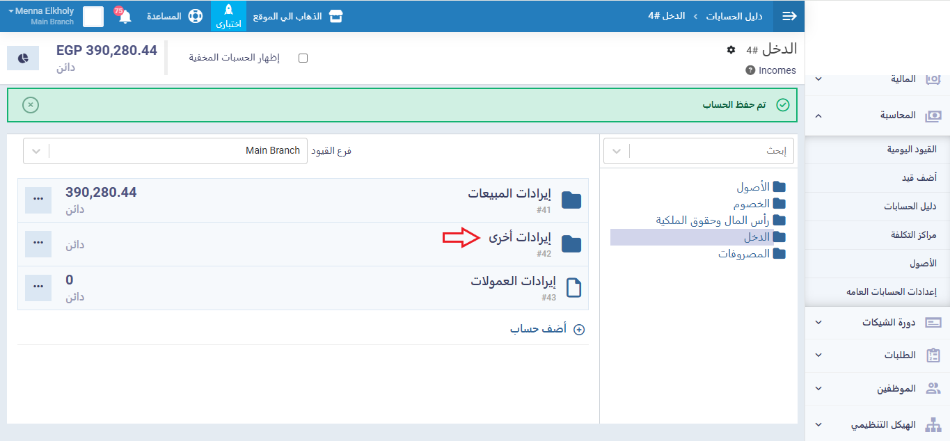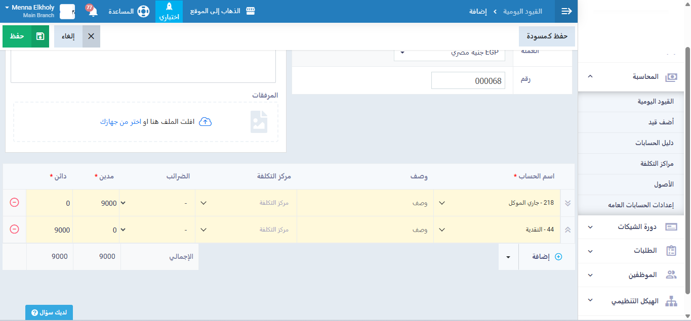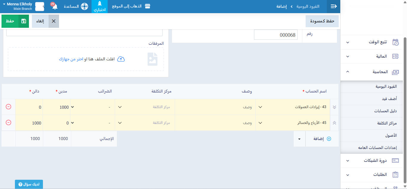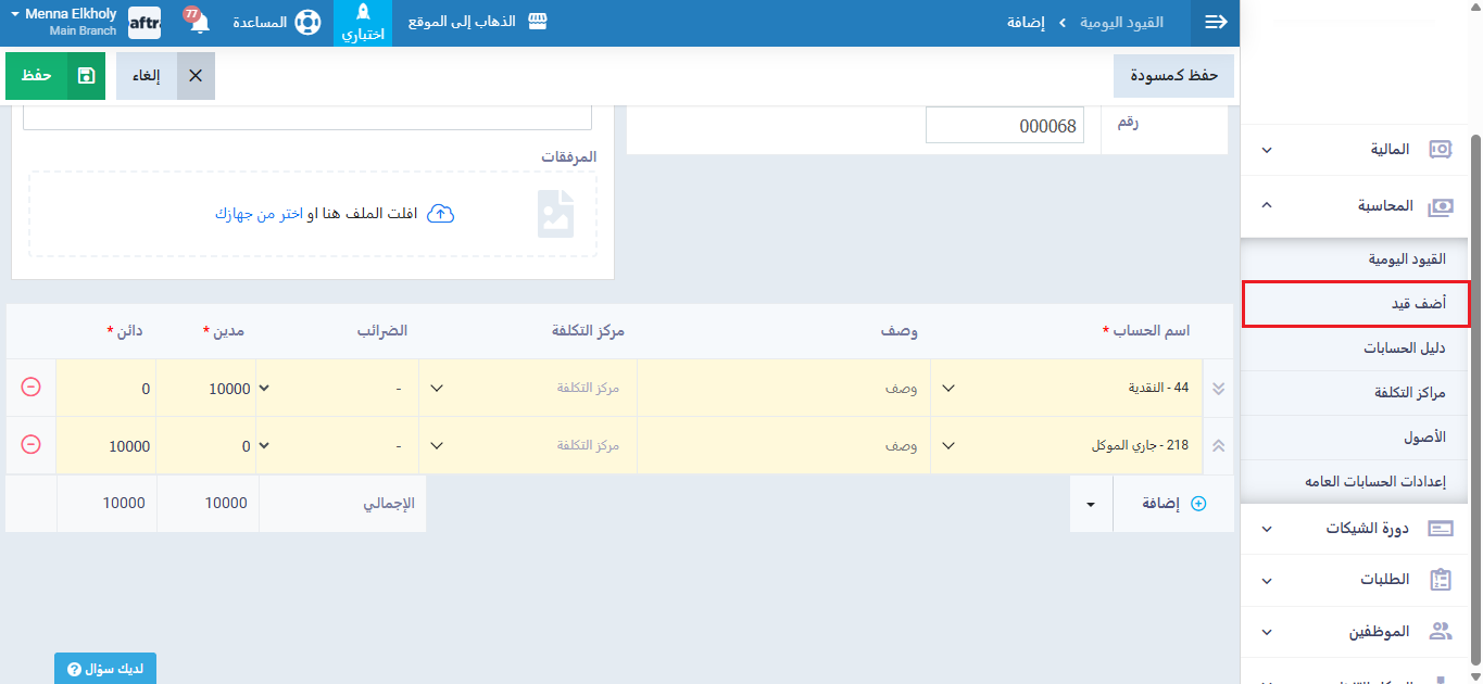 من القائمة الرئيسية اختر “المحاسبة” ثم اختر “أضف قيد”.