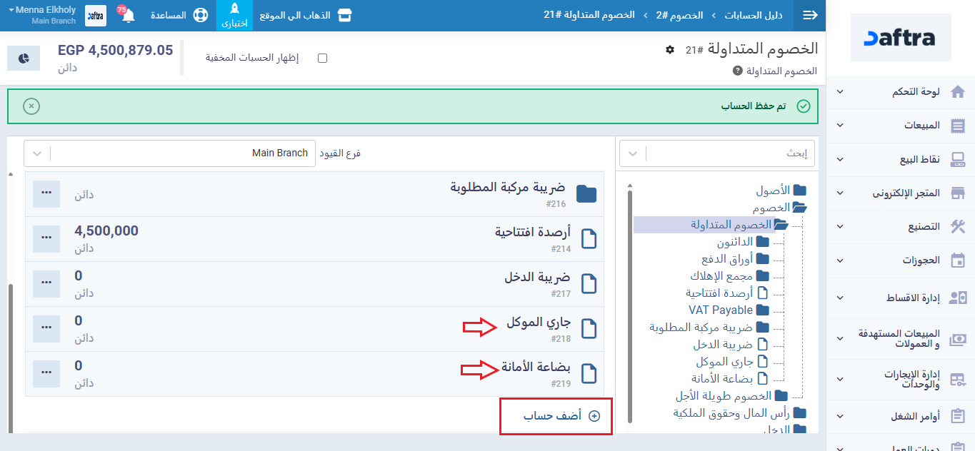 • اختر الحساب: حساب بضاعة الأمانة (الحساب الوسيط).