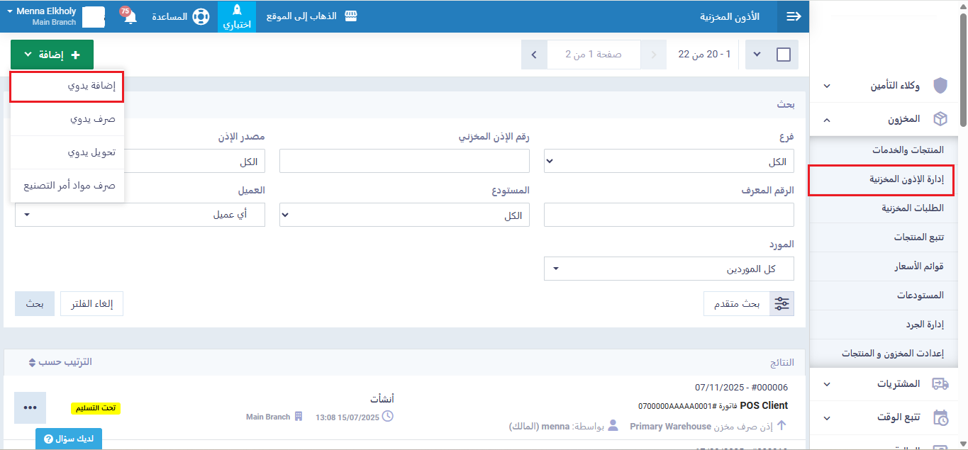 • انتقل إلى “المخزون” ثم إلى “إدارة الأذون المخزنية”.