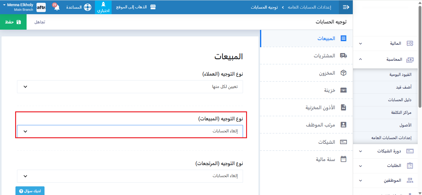 • انتقل إلى “المحاسبة” ومنها اختر “إعدادات الحسابات العامة”، ثم “توجيه الحسابات”.