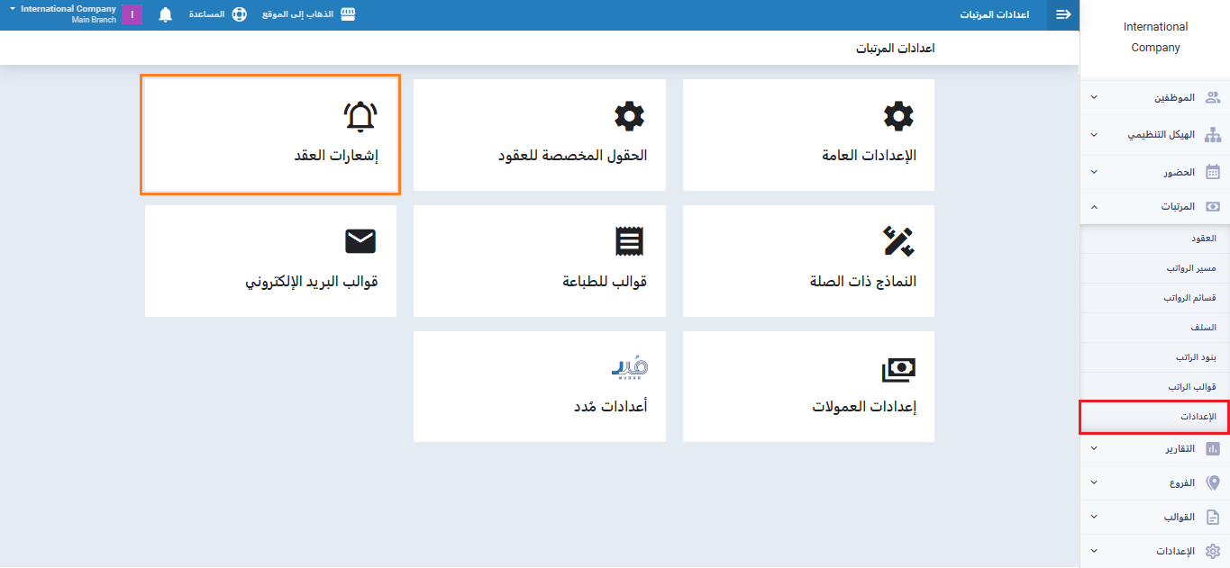 لضبط المدة التي ينبغي إبلاغك قبلها بإنتهاء عقد الموظف، اضغط على “الإعدادات” المنسدلة عن “المرتبات” بالقائمة الرئيسية، ثم اضغط على “إشعارات العقد”.