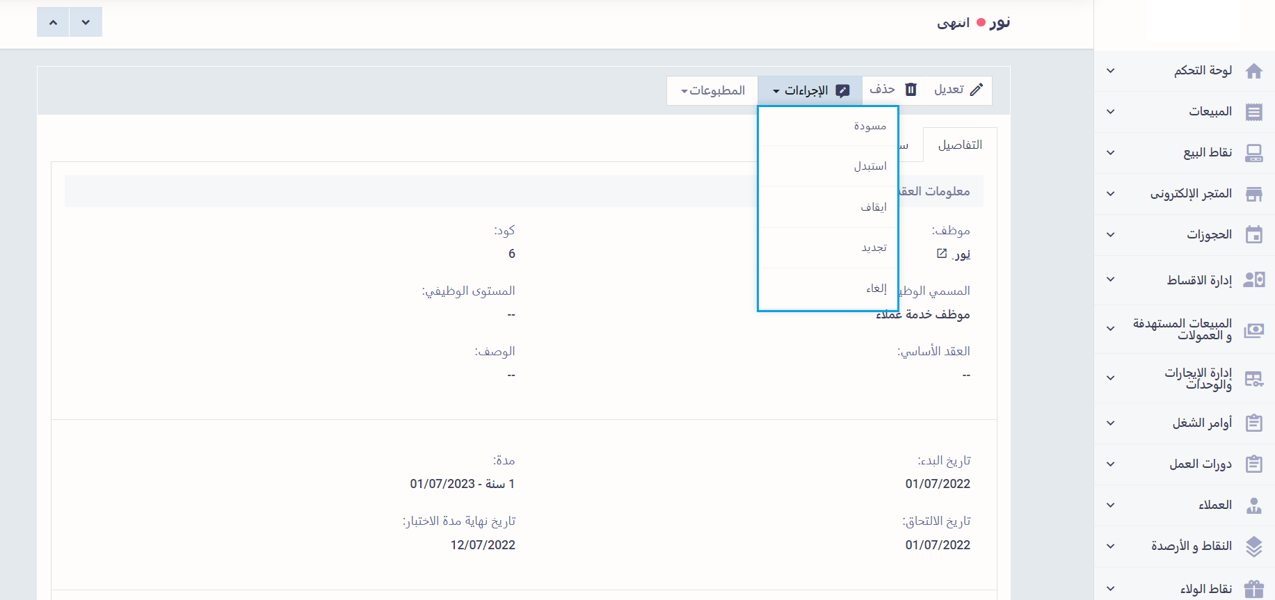 عند اختيار “تجديد” ينبغي عليك إعادة تعيين كل التواريخ المتعلقة بفترة العقد الجديد كتاريخ الالتحاق والانتهاء وتاريخ توقيع العقد.