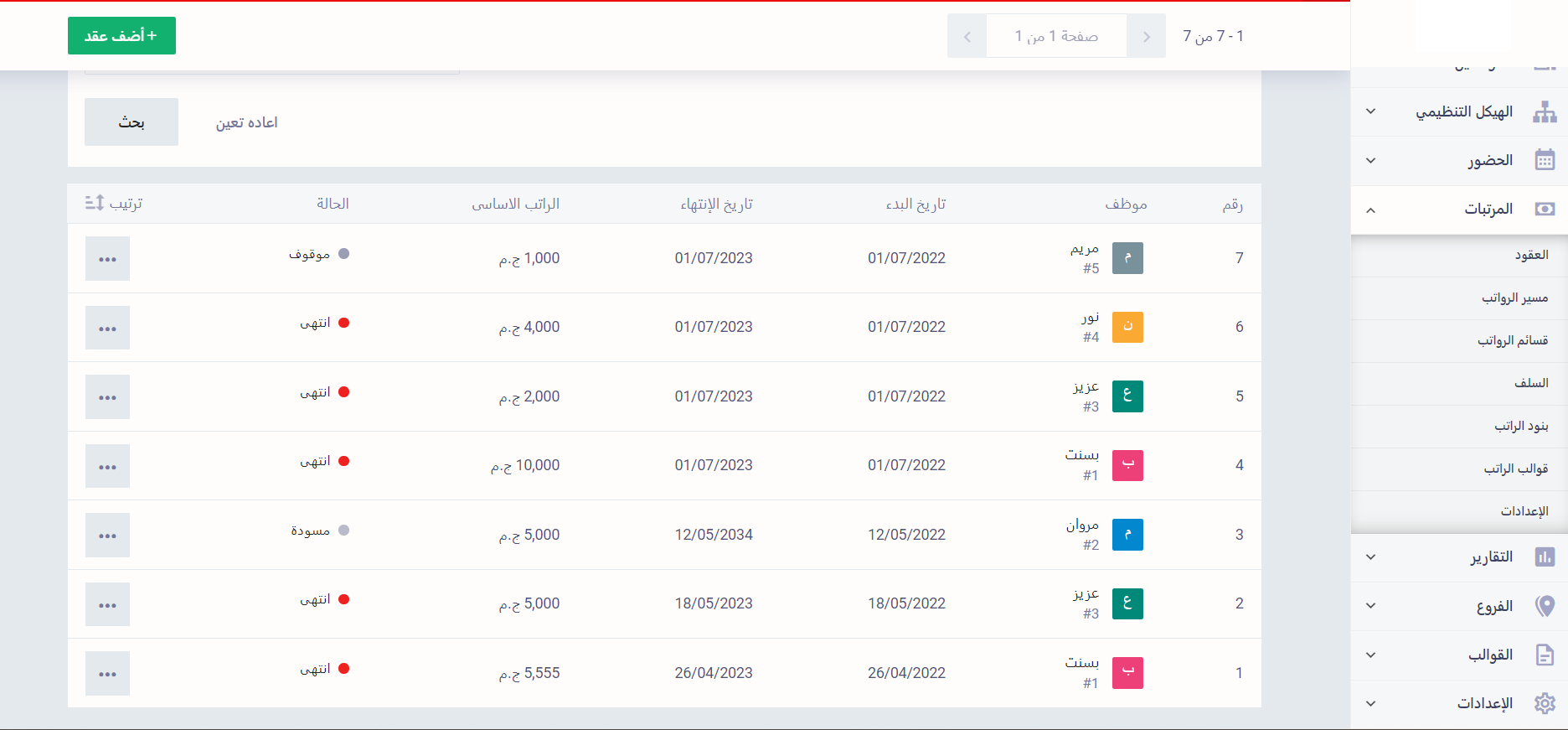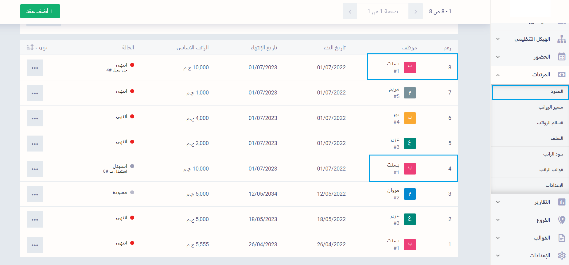 للقيام ببعض الإجراءات على العقود اضغط على “العقود” المنسدلة عن “المرتبات” بالقائمة الرئيسية، ثم اضغط على العقد المراد.
