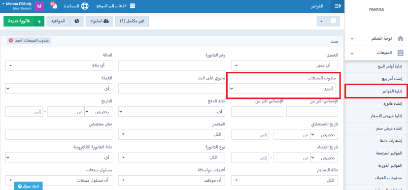وبالمثل يمكن تطبيق الفلترة باسم مندوب المبيعات في تقارير المبيعات لعرض بيانات المبيعات الخاصة به فقط.