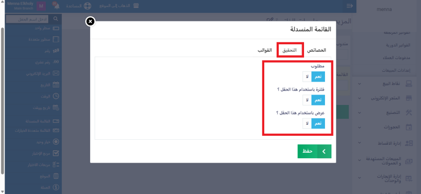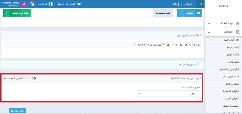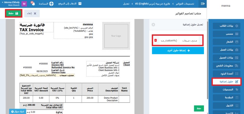 من إعدادات القالب أضف حقول إضافية، وأدخل اسم الحقل: مندوب مبيعات، ثم أضف المتغير الخاص بمندوب المبيعات داخل القالب. اضغط على زر حفظ.