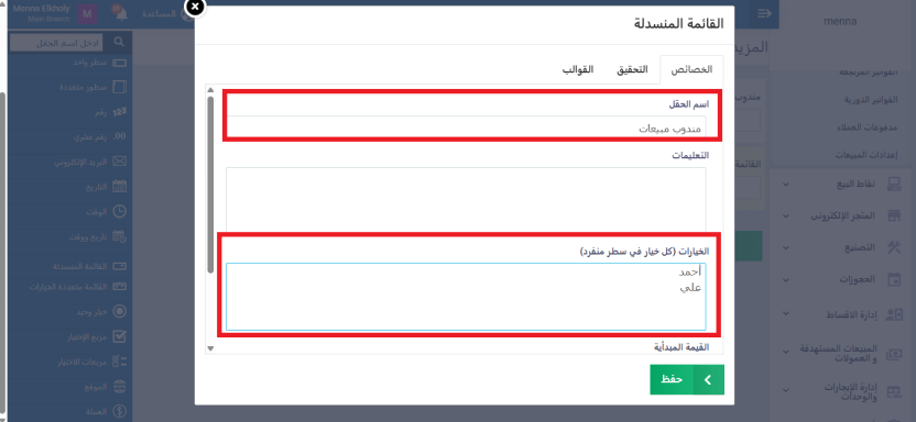 اختر نوع الحقل قائمة منسدلة، ثم في خانة اسم الحقل أدخل: مندوب مبيعات، وفي خانة الخيارات اكتب أسماء مندوبي المبيعات (كل اسم في سطر منفصل).