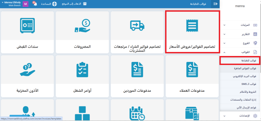 حتى يظهر حقل مندوب المبيعات داخل قالب الفاتورة، انتقل من القائمة الرئيسية إلى القوالب، ثم اختر قوالب للطباعة، اختر تصاميم الفواتير/عروض الأسعار، ثم حدد قالب الفاتورة الذي تريد تعديله.