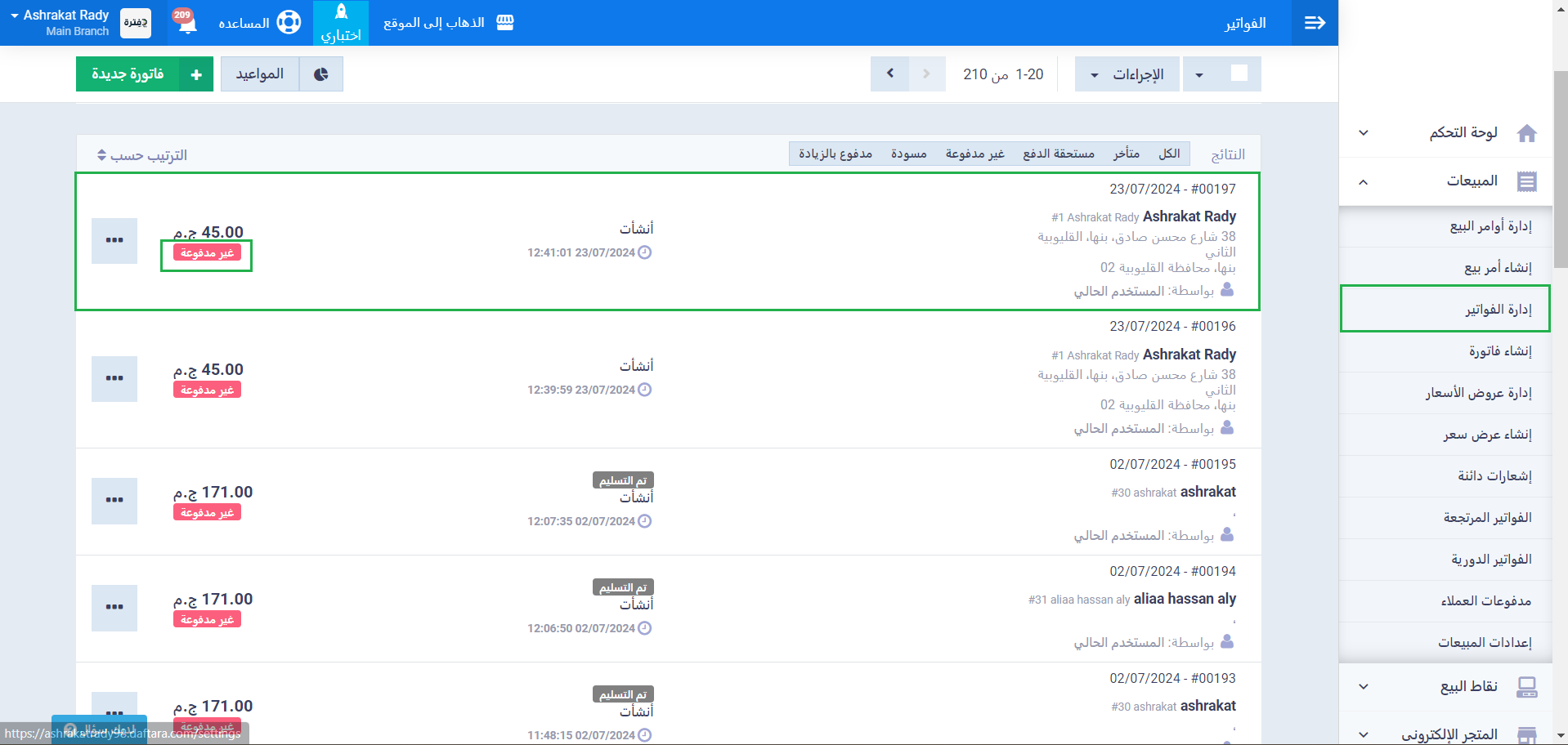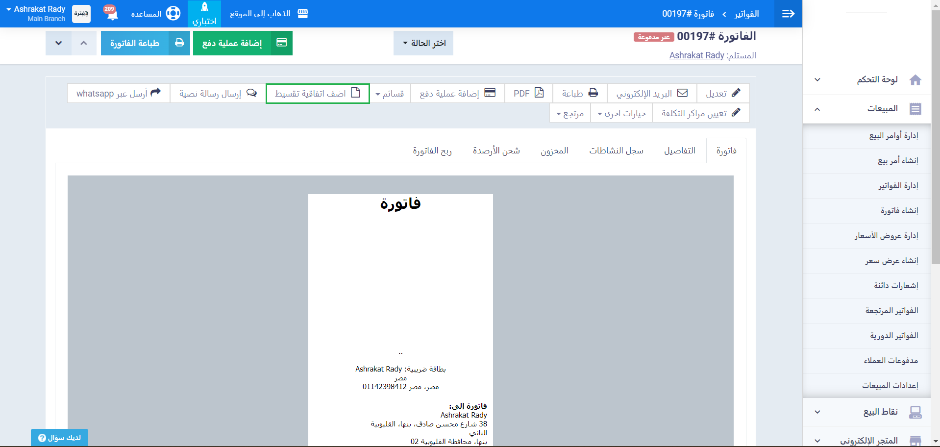 اضغط على “إدارة الفواتير” المنسدلة عن “المبيعات” بالقائمة الرئيسية واختر الفاتورة المراد إضافة اتفاقية تقسيط لها بشرط ألا تكون هذه الفاتورة مدفوعة كليًا.