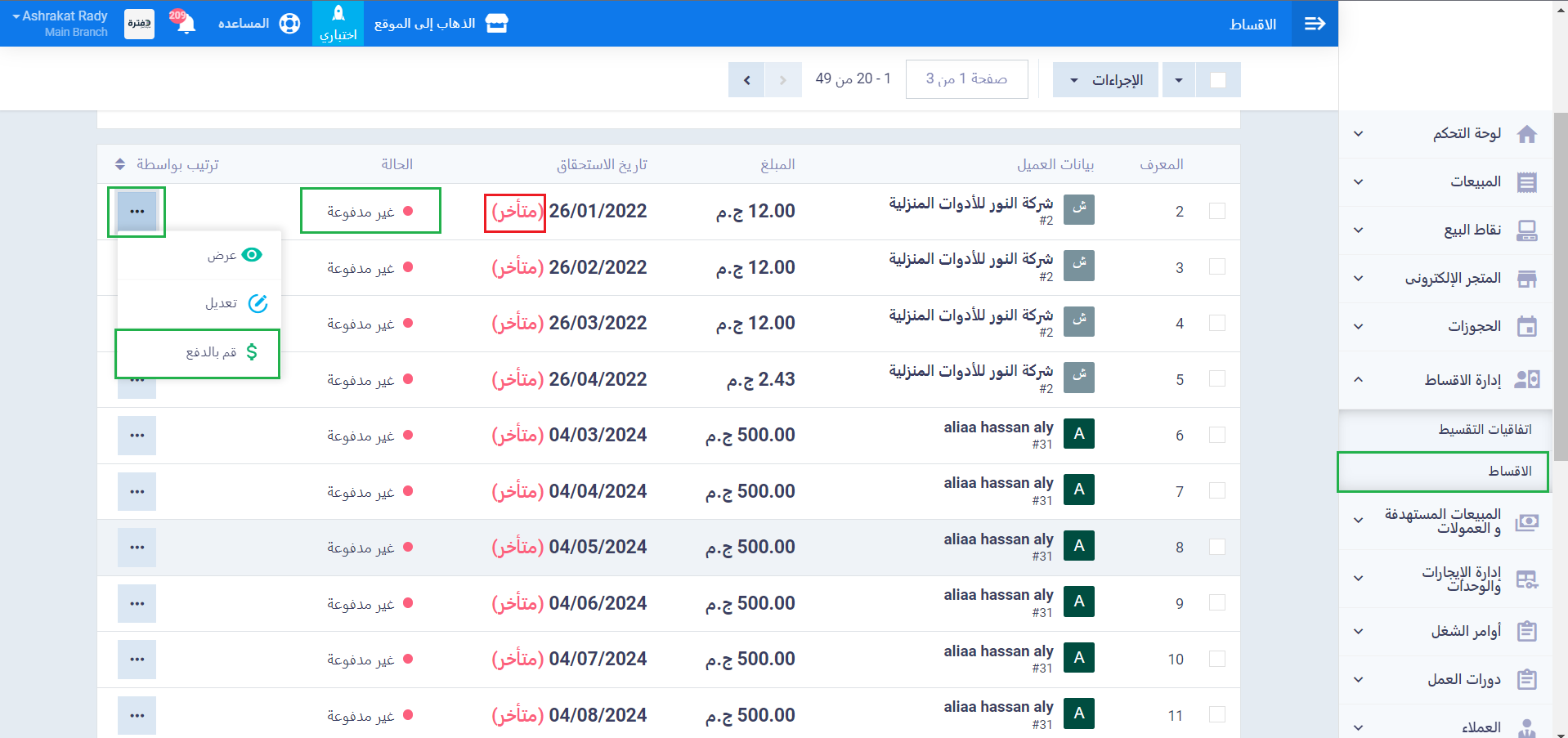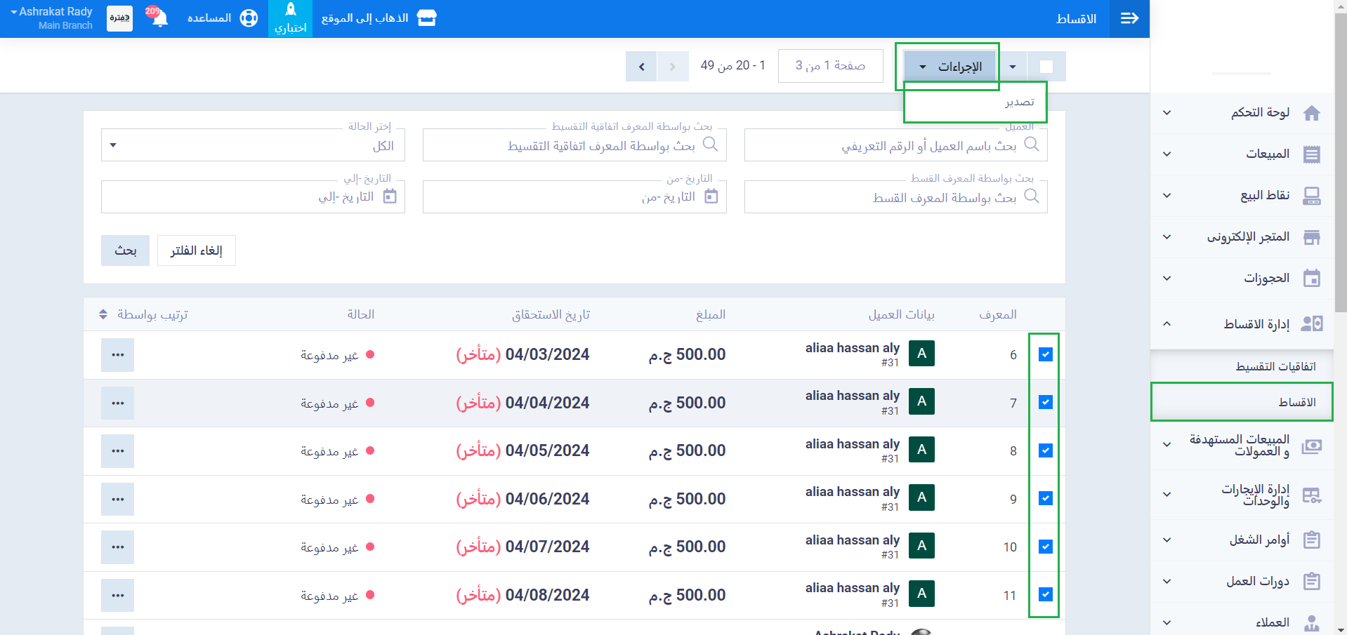 • ملحوظة: يمكنك تحديد كل الأقساط مرة واحدة من خلال النقر فوق مربع الاختيار الموجود أعلى يمين الشاشة بجوار زر “الإجراءات“.