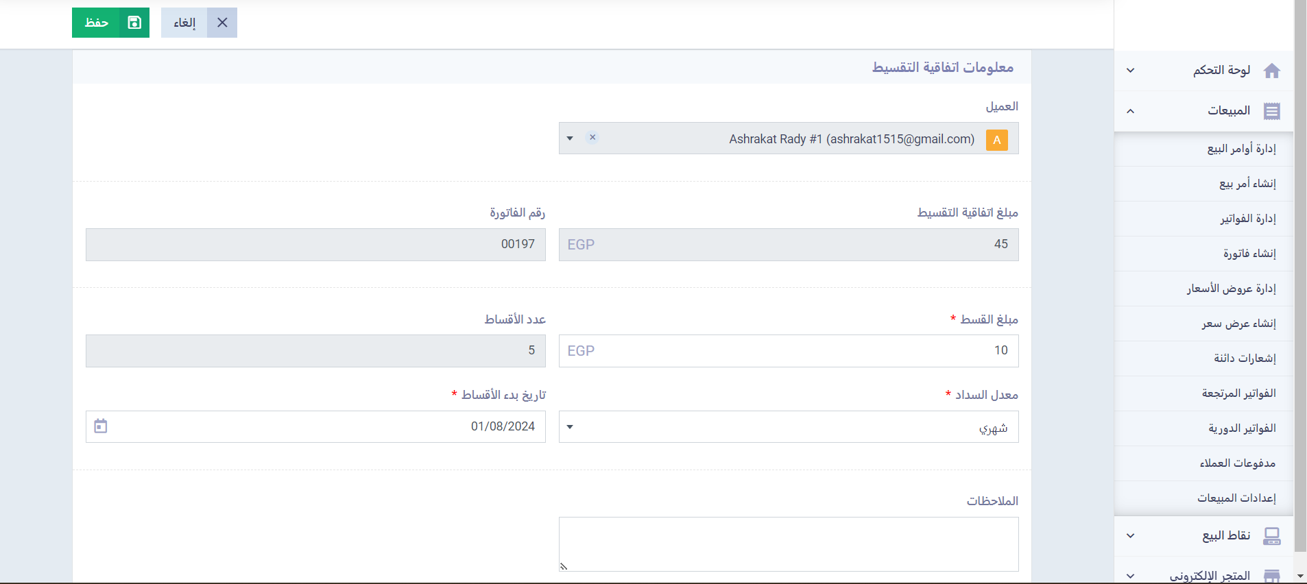 • الملحوظات: أدخل أي ملحوظات متعلقة باتفاقية التقسيط إن وجد