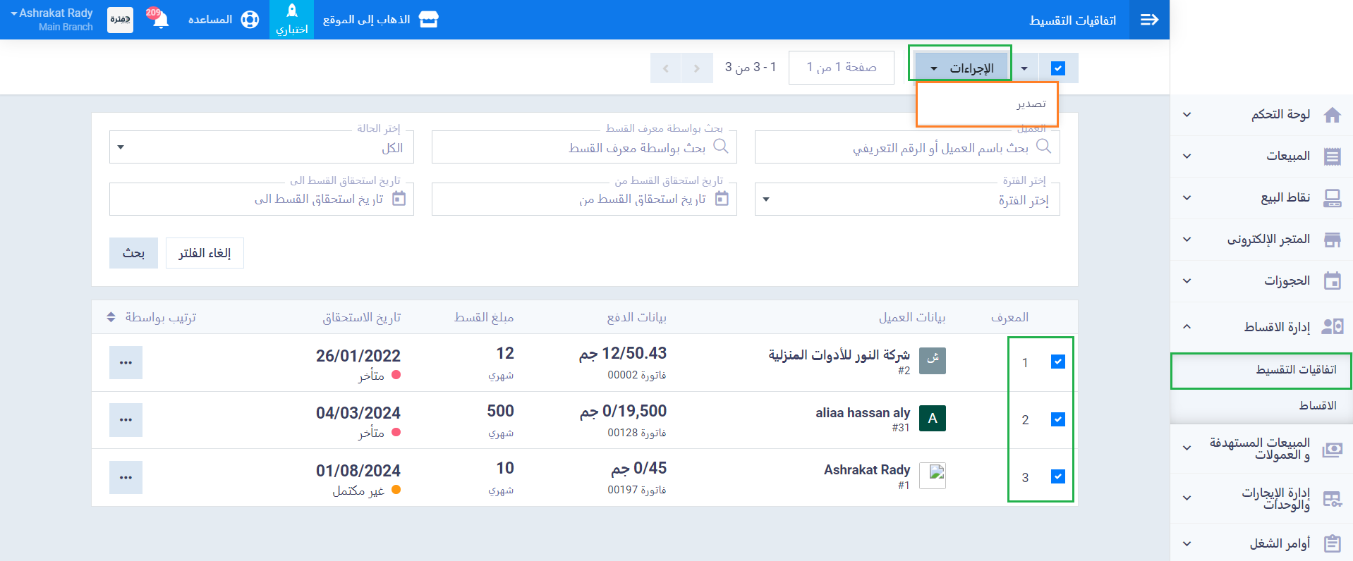 يمكنك تصدير اتفاقيات التقسيط وتحميلها في ملف إكسيل يسهل الإطلاع عليه ومتابعته وتحديثه، وذلك بالضغط على “اتفاقيات التقسيط” المنسدلة عن “إدارة الأقساط” بالقائمة الرئيسية وقم بتحديد الأقساط المراد تصديرها بالضغط على علامة ✅ ثم اضغط على زر “الإجراءات” واضغط على “تصدير”.