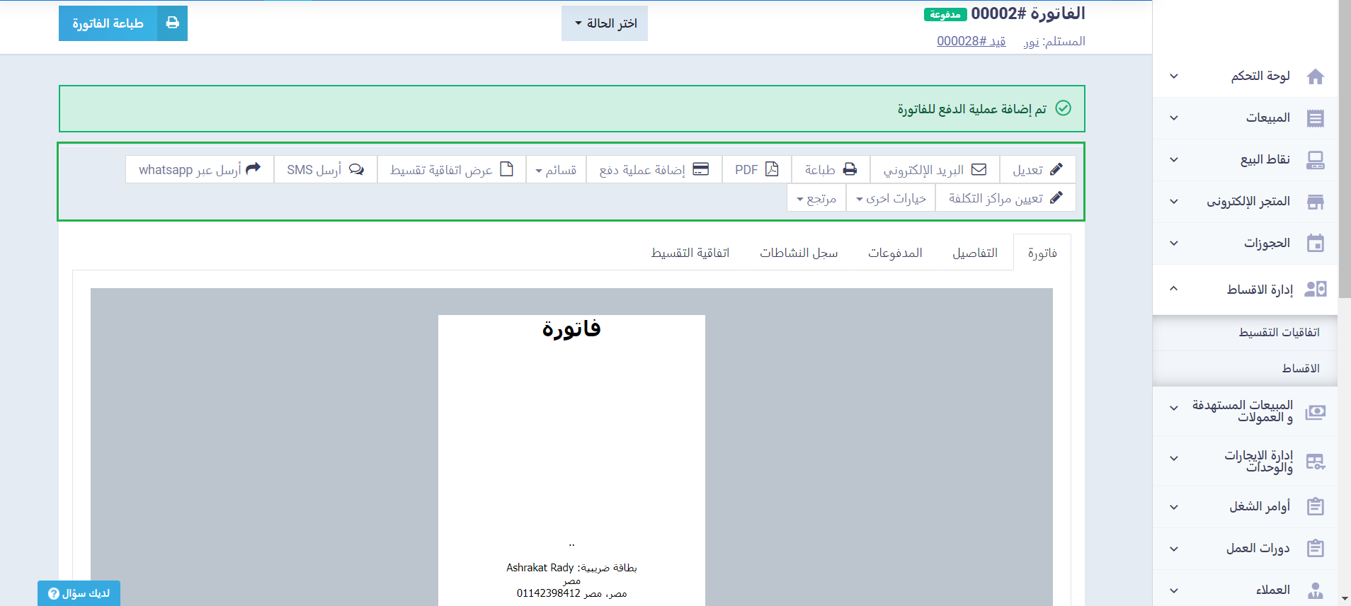 • سيقوم النظام بتغيير حالة القسط من “غير مدفوع” إلى “مدفوع” مع إضافة هذا المبلغ المدفوع إلى بيانات الفاتورة وتخفيض المبلغ المستحق بها.