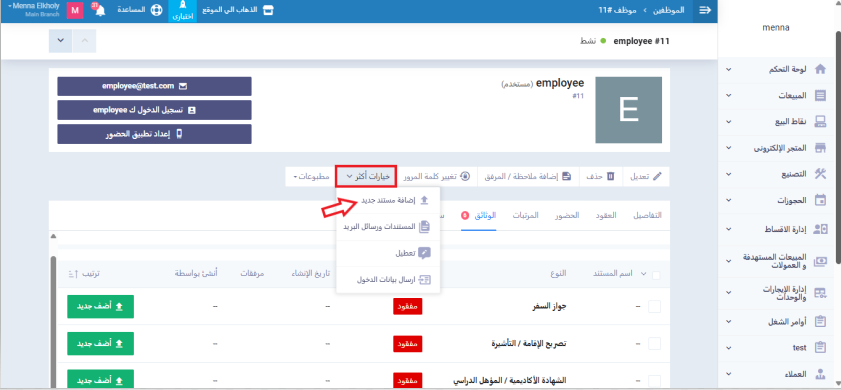 يمكنك إضافة مستند جديد مباشرة من داخل ملف الموظف عبر الضغط على زر “خيارات أكثر” ثم اختيار “إضافة مستند جديد” من القائمة المنسدلة.