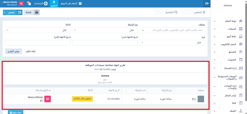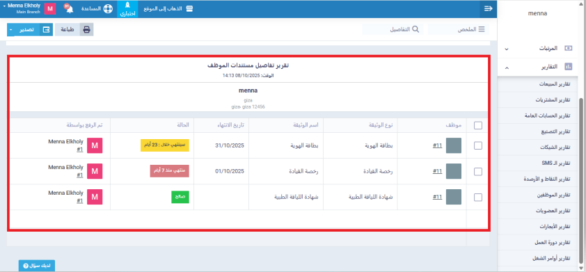 تقرير انتهاء صلاحية مستندات الموظف