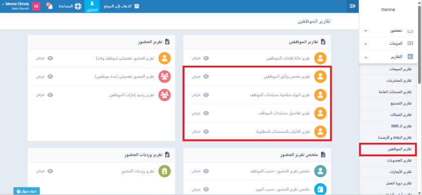 من القائمة الرئيسية، انتقل إلى “التقارير” ثم إلى “تقارير الموظفين”، حيث ستجد أربعة تقارير رئيسية لمتابعة حالة المستندات في النظام.