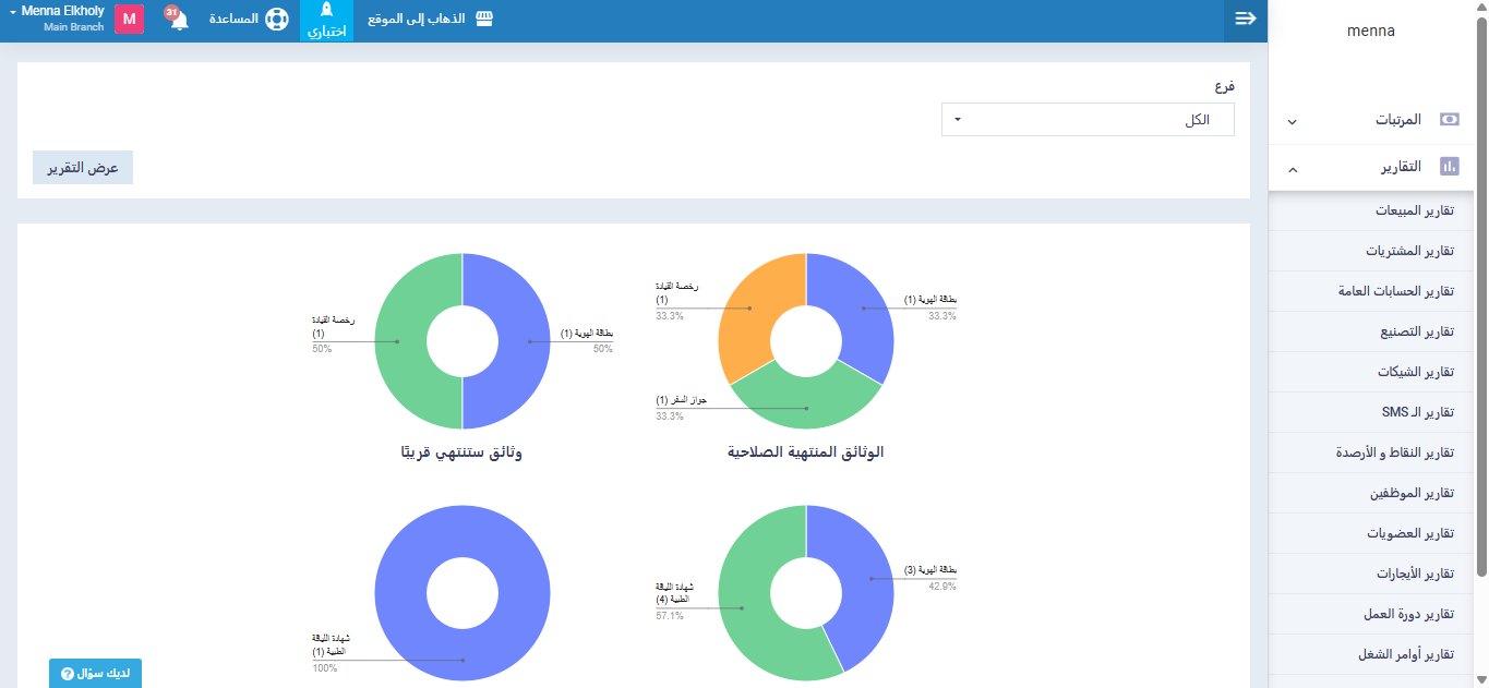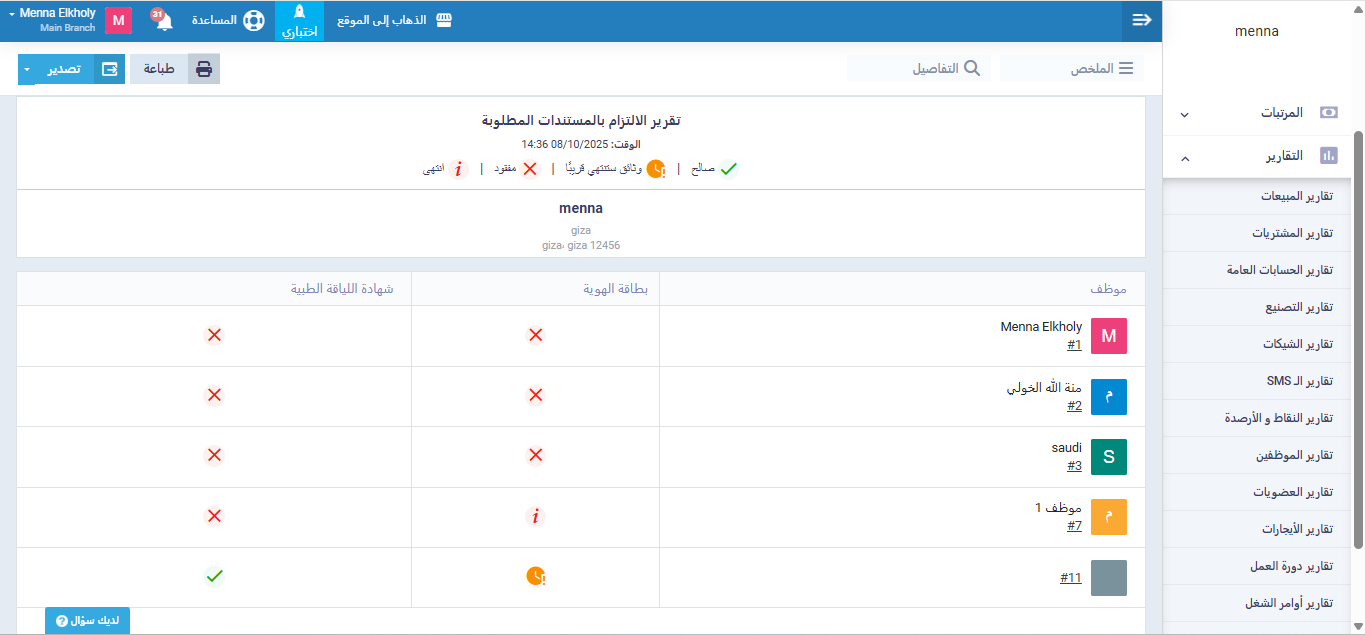 يعرض هذا التقرير ملخصًا عامًا لمستندات جميع الموظفين، ويمكن تصفيته حسب القسم أو الفرع.